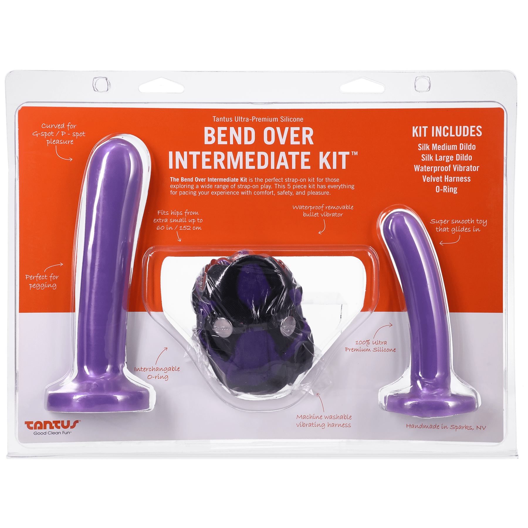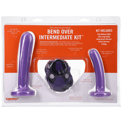 The Bend Over Intermediate Kit includes a 4-way classic strap adjustable harness, Silk Medium, Silk Large dildos, a 1.48" and a 1.53" O-ring, along with a bullet vibrator which fits into a small front channel in the harness. The additional O-Ring accomodates toys of different diameter giving you the opportunity to scale up to your strap-on playexperience. The harness fits up to 60" hips. Dildos sizes are: Silk Medium 1/4”x 5-1/2” and Silk Large 1/2”x 7”. The Harness is machine washable, when placed in a delicates bag, using mild detergent or you can handwash. Make sure to remove the bullet vibe prior to washing. Hang drying the Harness is recommended. Our silicone dildos are dishwasher safe, toy cleaner compatiable or you can handwash them using mild soap and water, too.