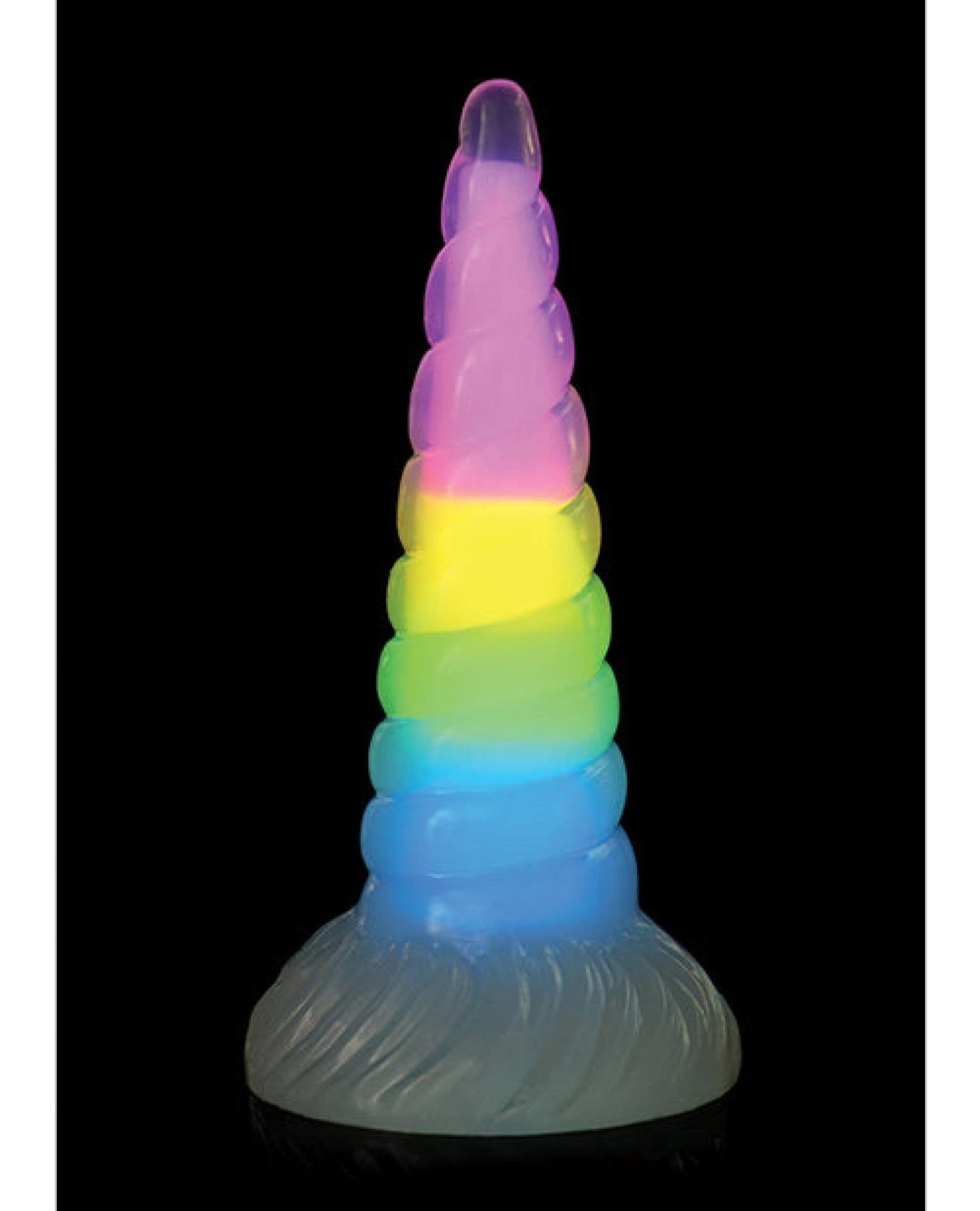 Indulge in the enchanting pleasure of the Creature Cocks Uni Glow in the Dark Silicone Dildo - Rainbow and let your fantasies come to life in the most colorful way possible.