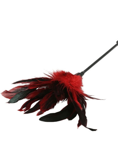 A treacherous tool that goes both ways. Alternate instantly between pleasure and pain with this sexy and playful red feather slapper. One end boasts a plume of frisk feathers in dramatic red and black to titillate and tickle for your amusement. Switch up the sensation at a moment's notice with a curt crop to swat and slap your subjects delectable hiney, thigh, or feet. Great when paired with blindfolds, lingerie, or a Sportsheets restraint system.