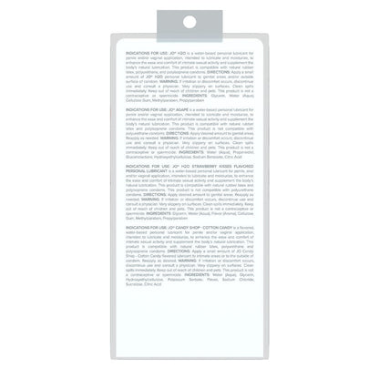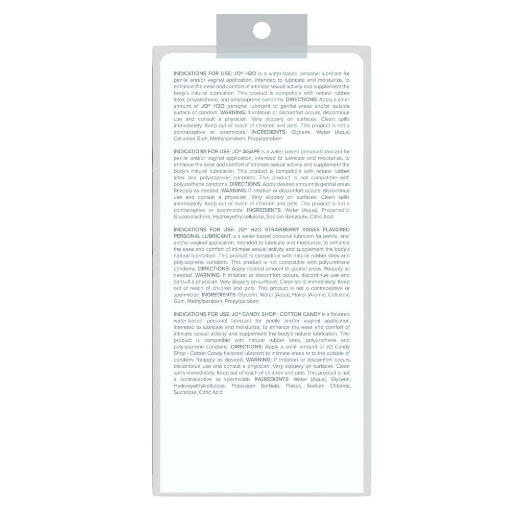 JO Four Play gift set can be thought of in two ways. First, as a sampler that lets you try four amazing formulas. Second, as a getaway kit for a long, sensual weekend. You'll get 2oz each of our versatile H2O Original, pH balanced Agape, naturally familiar Strawberry, and playful Cotton Candy flavored lubricants. All four foils provide the sensual, comforting glide and silky-smooth feel our water-based formulas are known for.