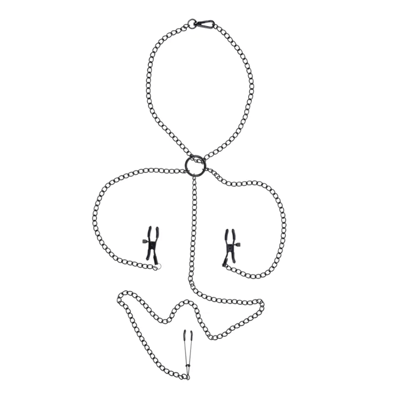Ignite your passions and take intimacy to sensational new heights with the Saffron Nipple to Clit set. Perfectly crafted for use both in and out of the bedroom, feel the illustrious black chains drape down your body from the connected chain collar. Tease yourself with attached nipple clamps to add pressure and arousal to your most sensitive areas while a third tweezer clamp stretches down to your clit for tantalizingly seductive tension. Perfect to create heightened experiences during sensation play or as a playful reminder of your submissive place as its worn under your clothes. Secure and comfortable, the Nipple to Clit Set allows you to reign in your pleasure however you like as they tug and tease with every movement.
