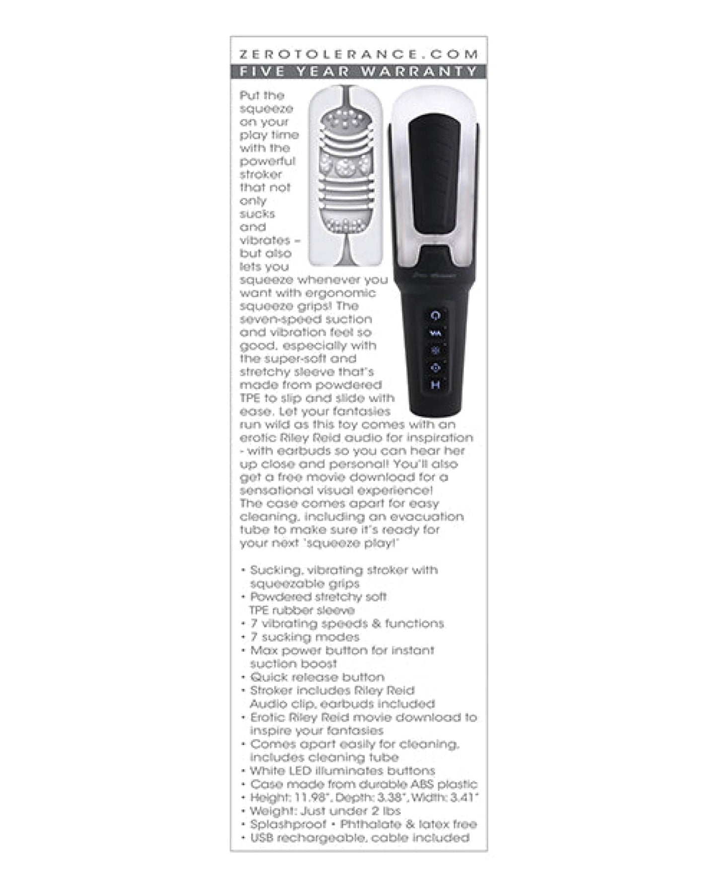 Indulge in pure pleasure with the Zero Tolerance Squeeze Play W-riley Reid Audio & Movie Download in sleek black. This powerful stroker is not your average toy - it not only sucks and vibrates, but it also features ergonomic squeeze grips that allow you to control the pressure just the way you like it.